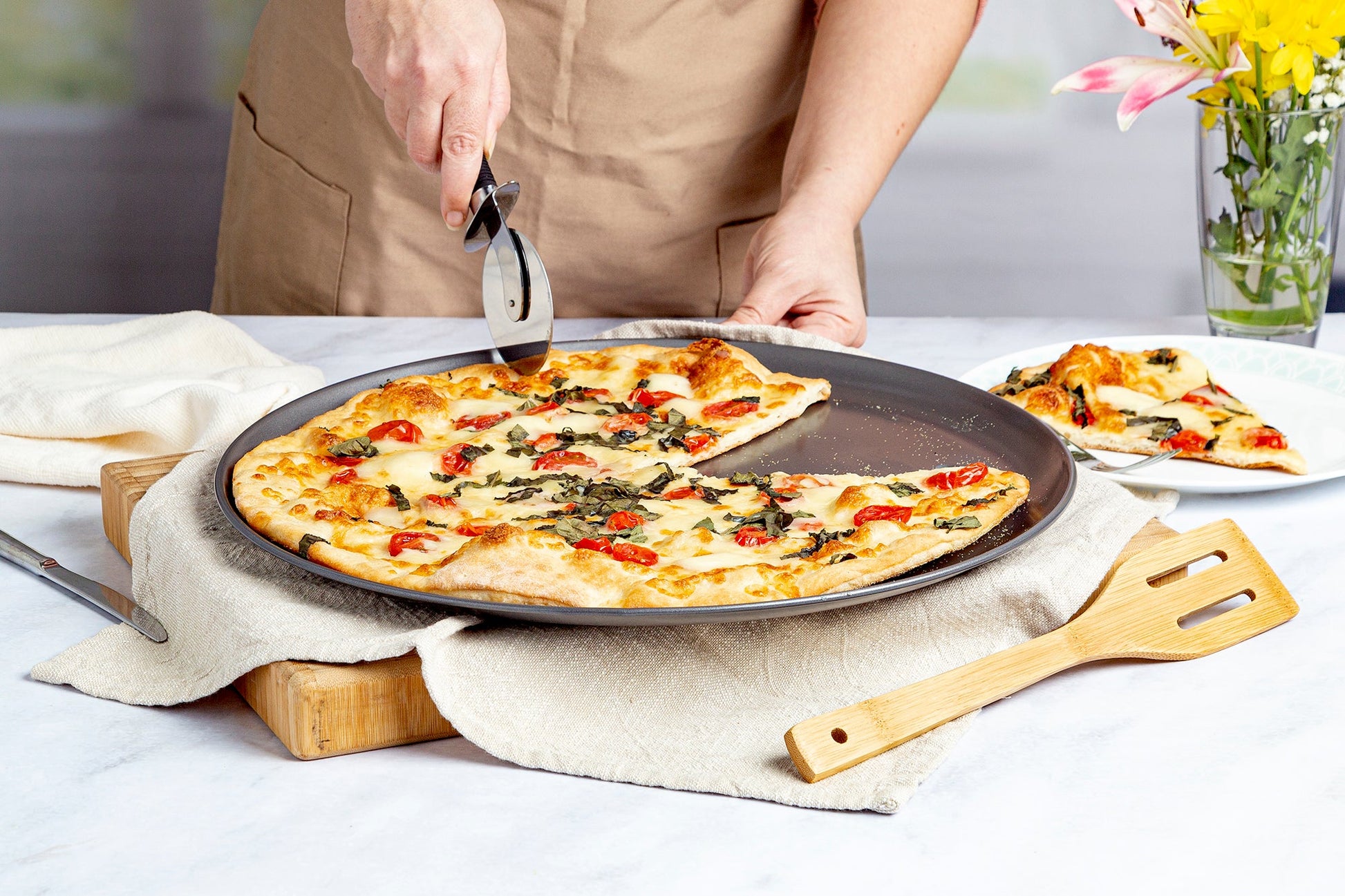 Make pizza as good as the ones you order from your local Italian restaurant. The carbon steel construction of the durable BakeIns™ non-stick pizza pan is designed to bake and brown evenly, so you can achieve perfect pizza every time. And even if you’re not a great chef, this non-stick pizza tray is just as useful for frozen pizzas, giving your pizza a tasty, crisp and golden crust. Making pizza at home is easier when you use the durably crafted BakeIns Non-Stick 13” or 15 ¾” Pizza Pan. Our proprietary non-stick coating is safe, made without BPA, PFOA or PTFE, and offers effortless food release. This non-stick pizza pan is dishwasher safe and easy to clean, so you have more time to enjoy the pizza party.