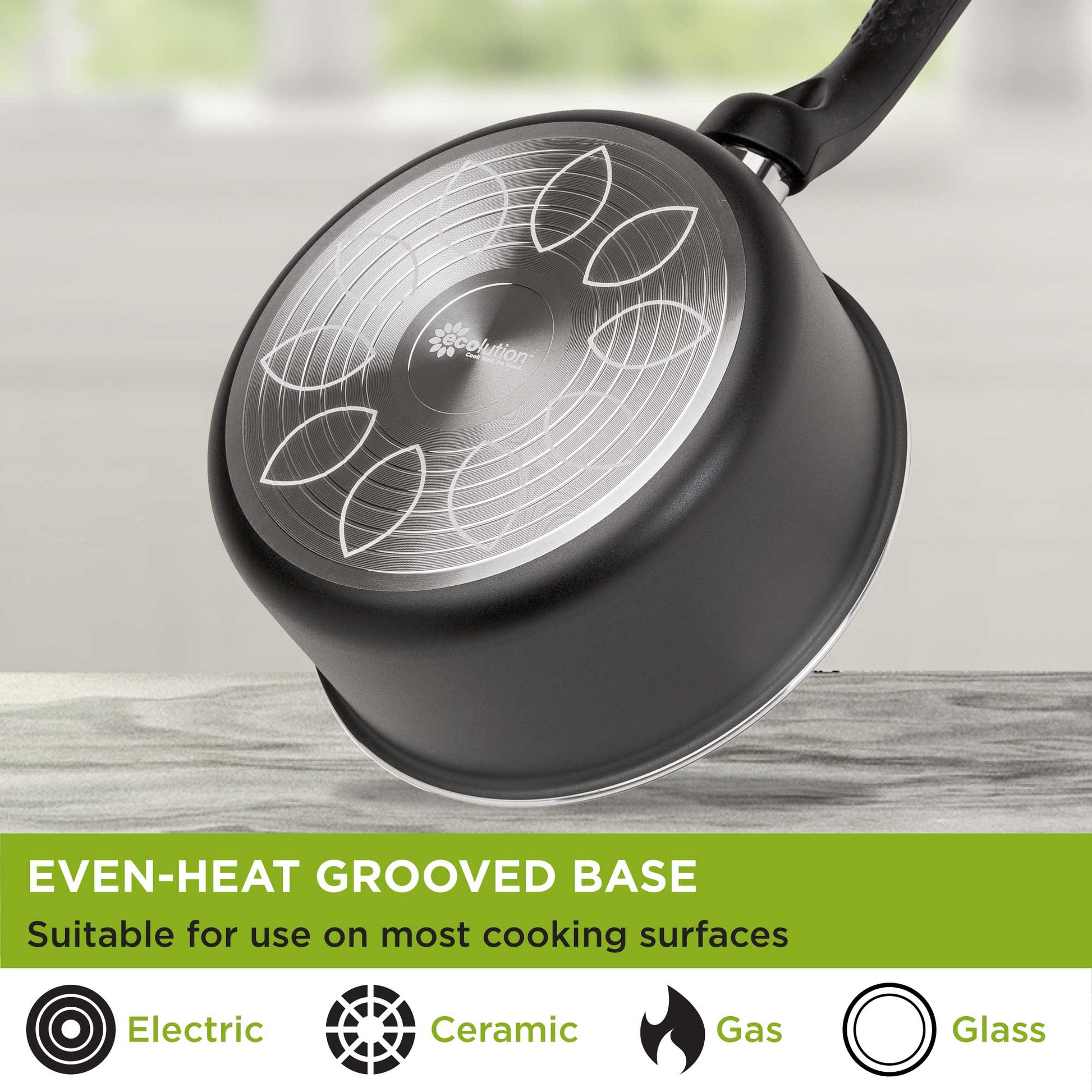 Mix up something appetizing in our durable Evolve Saucepan, crafted in heavy gauge aluminum for reliable performance. With our water-based, Hydrolon® non stick coating for effortless food release, healthy cooking is easier because you can use less butter and oil. This saucepan includes a tempered glass lid with steam vent so you can keep an eye on your culinary creation while it’s cooking. The stay-cool silicone handle has a comfortable grip. After your meal, cleanup is easy and fast because the Evolve Saucepan is dishwasher safe.