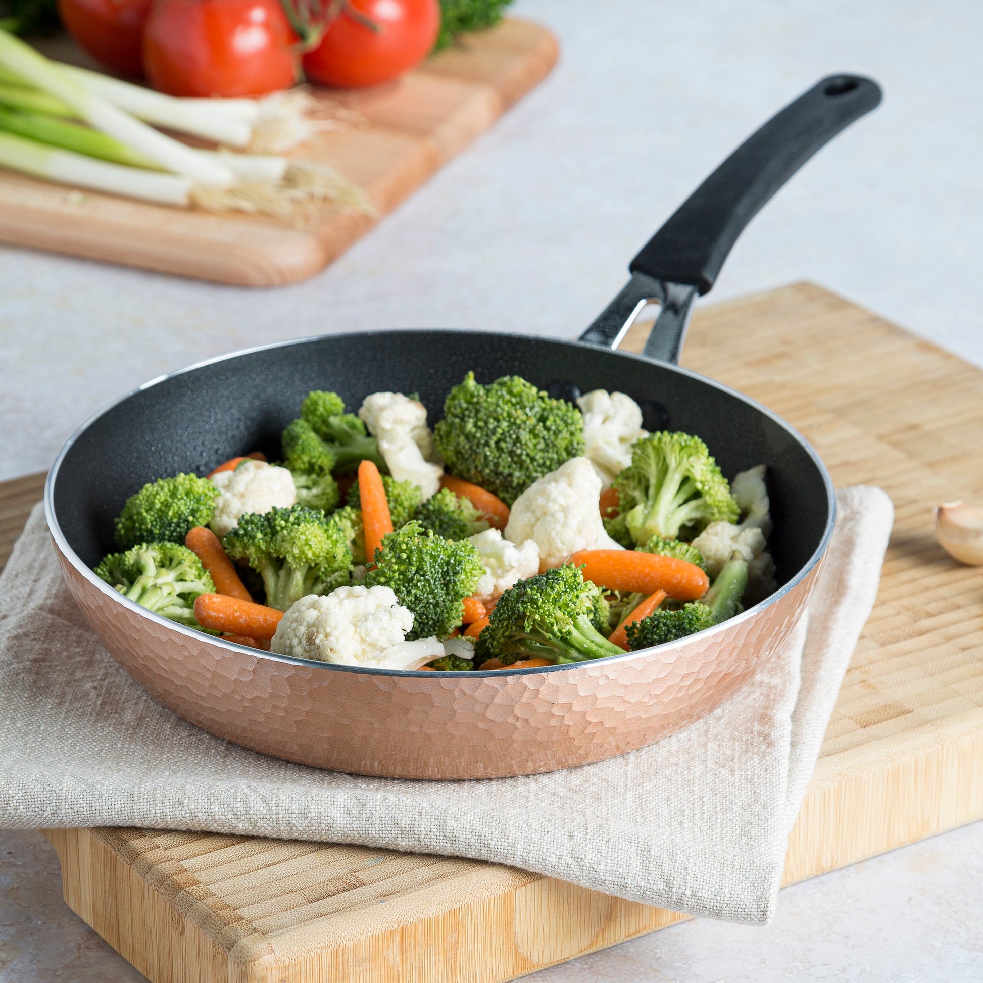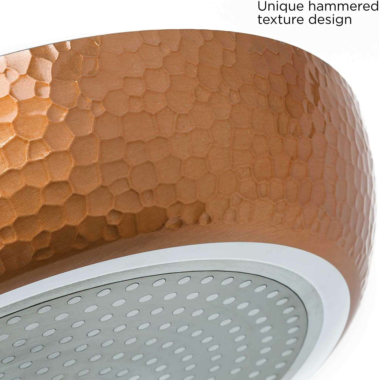 With a beautiful hammered copper exterior design and a safe, yet durable non-stick coating, the Impressions cookware set from Ecolution has everything you need to cook gourmet meals from home. Cooking for a crowd? The large Dutch oven and deep saute pan can make large servings. For smaller meals or dishes, the fry pans and saucepans are perfect for making all of your favorite foods.